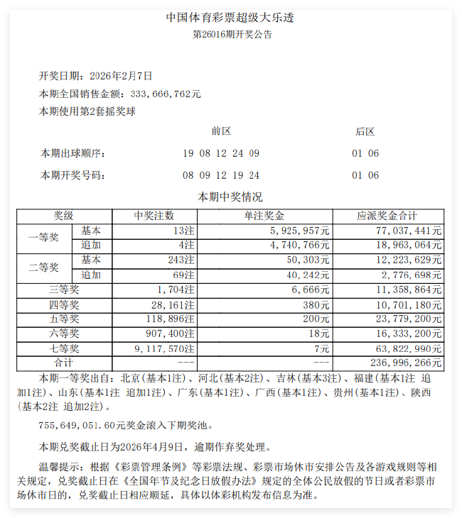 北京时间2月7日晚,体彩大乐透第26016期开奖,当期开奖号码为前区08 09 12 19 24,后区01 06。本期是大乐透规则变更后的第三期,原九等奖级变更为现七等奖级,具体详情点击查看:中国体育彩票超级大乐透游戏规则